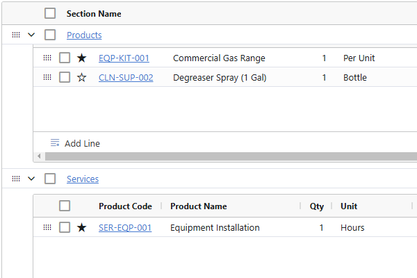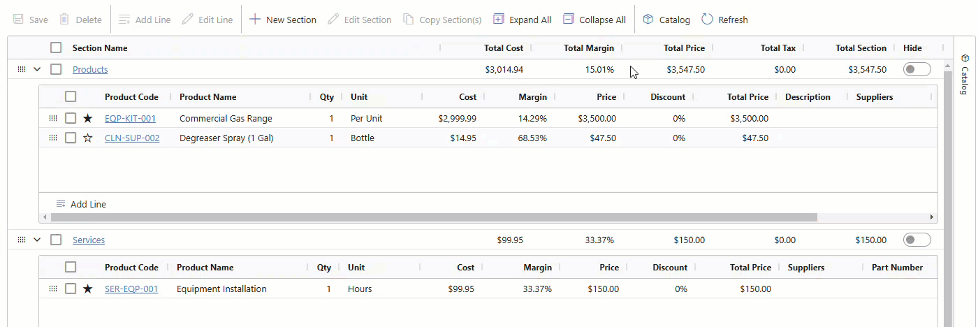 One or more sections can be added to separate items or to provide scenario quoting. Sections and line items can be reordered by dragging & dropping.